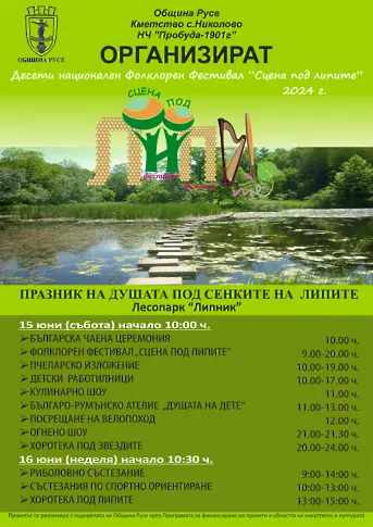 На 15 и 16 юни /събота и неделя/ в местността Лесопарк „Липник” ще се проведе 10-ото издание на Националния фолклорен фестивал „Сцена под липите”. Събитието се реализира с подкрепата на Община Русе, кметство Николово и Народно читалище „Пробуда - 1901“, като в него ще се включат близо 1000 участници и 100 състава от цялата страна и от съседна Румъния.