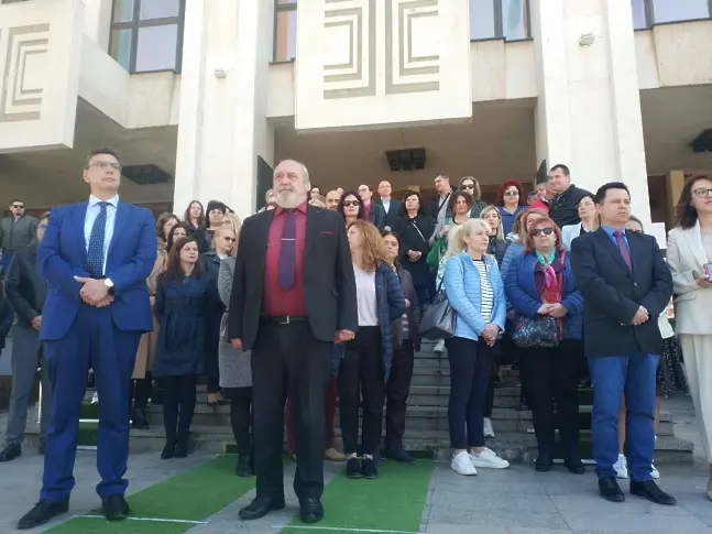 Над 100 прокурори, следователи и служители в администрацията излязоха днес пред Съдебната палата в Бургас, за да изразят подкрепата си за обвинител номер 1 на Републиката Иван Гешев, чийто кортеж вчера бе атакуван между Самоков и село Ковачевци. Случаят бе определен от магистратите в областния център като опит да бъдат взривени устоите на държавността и правовия ред.