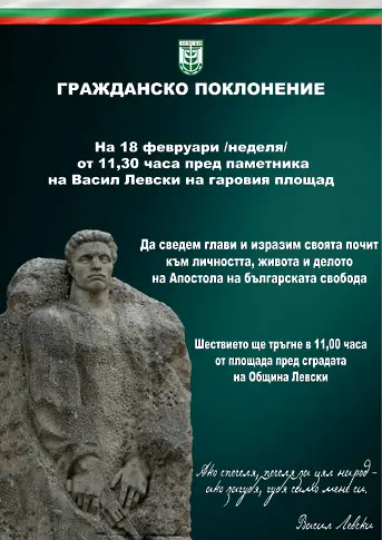 На 18 февруари в град Левски ще сведем глави пред подвига и саможертвата на карловеца Васил Иванов Кунчев, Апостола на Свободата, българинът завещал ни безпределната си любов към Отечеството с дела и думи: