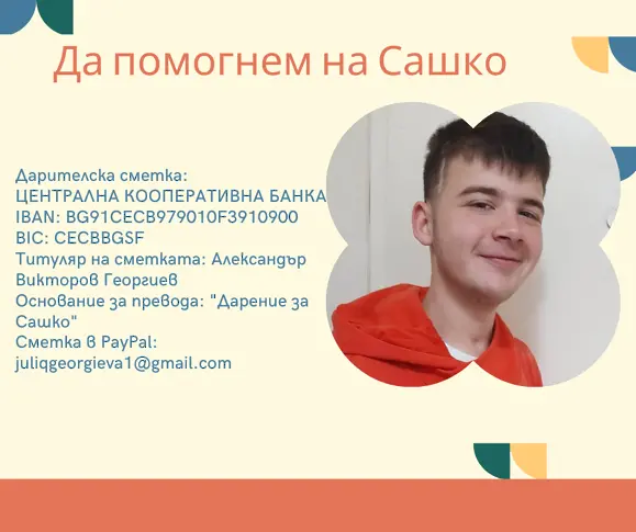 Коства ми много време да преодолея себе си и да се обърна към Вас за помощ, защото знам, че държавата ни трябва да се погрижи за децата си, но също знам, че ние сме сърцето на тази наша България и заедно помагаме на чудесата да се случват. От все сърце благодаря на всички, които четат това, споделят го и подаряват частичка надежда на Сашко!"