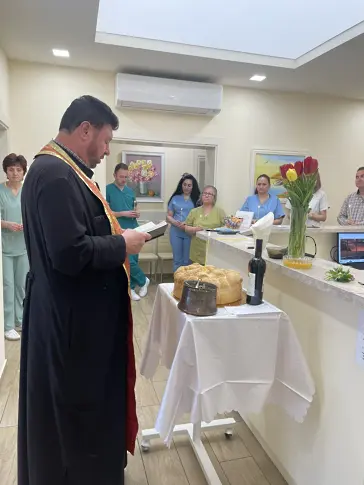 Отец Лазар от пловдивския храм „Св. Неделя“ отслужи водосвет и отправи благопожелания. Той освети двата свещени символа на живота – водата и хляба, и поръси със светена вода присъстващите, както и помещенията. Свещеникът пожела здраве и благоденствие на всички от екипа и още много успехи по пътя на тяхната благородна мисия да подкрепят живота. На бъдещите майки пък пожела скоро да чуят жадуваната блага вест.