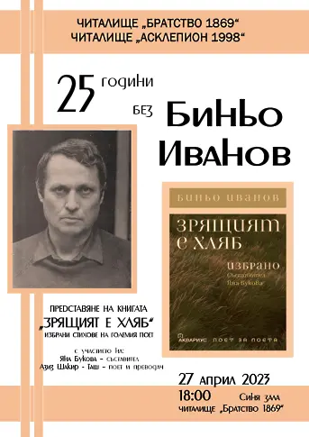 Днес от 18:00 ч. в Синята зала на читалище „Братство 1869“ гр. Кюстендил ще бъдат отбелязани 25 години от кончината на кюстендилския поет Биньо Иванов.