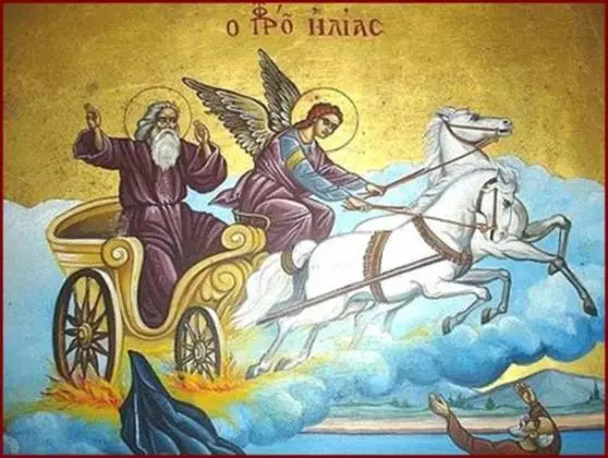 Житието на пророка представя как при смъртта му огнена колесница с огнени коне го отнесла с вихър на небето. Същия образ рисува и иконографията - св. Илия е в позлатена небесна колесница, теглена от четири бели коня. В християнизираните митологични представи, отразени и в песенната традиция, при подялбата на света на св. Илия се паднали "летни гръмотевици, летни трескавици"; св. Илия е господар на летните небесни стихии гръм и градушка;св. Илия ходи по небето със златна колесница и преследва ламята, която пасе житата; светкавиците са огнени стремена, които хвърля по ламята, или огънят, който излиза от ноздрите и изпод копитата на конете му, той дава дъжда и росата.