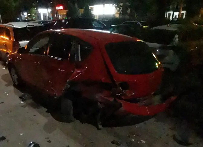 Паркираните коли са ударени от водача на първата кола.