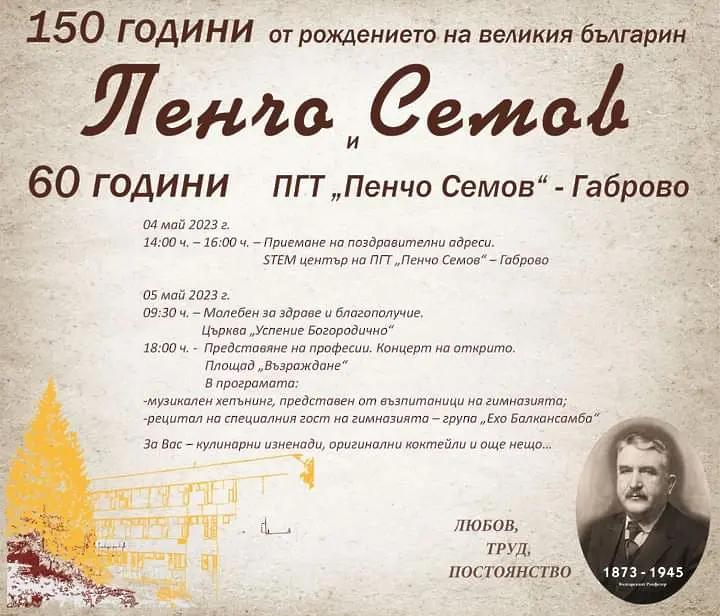 В годината, в която отбелязваме 150 години от рождението на благодетеля от Габрово Пенчо Семов Професионалната гимназия по туризъм „Пенчо Семов“ – Габрово ще отбележи 60 години от създаването си. В програмата организаторите са предвидили време за приемане на поздравления на 4 май от 14:00 ч. до 16:00 ч. в открития през изминалата година STEM център.