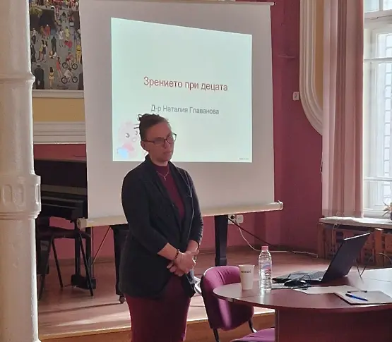 За медицинските сестри от здравните кабинети в детските градини бе проведена лекция на тема „Зрението при децата“. Участниците в срещата получиха информация за най-честите очни заболявания при децата, особеностите на детския зрителен апарат, видовете рефракционни аномалии и промяната на клиничната рефракция през годините на общия растеж при децата. На медицинските специалисти бе разяснено какво е „мързеливо око“ или амблиопия, кои са рисковите групи деца и трудностите при диагностицирането и лечението. Нагледно чрез снимков материал бе разяснено какво представляват страбизмът и псевдострабизмът.
