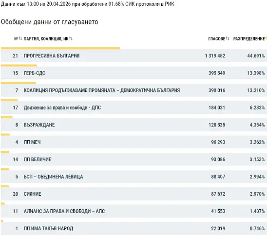 При обработени 91.68% протоколи на секционните избирателни комисии (СИК) в районните избирателни комисии (РИК) от изборите за народни представители за 52-рия парламент, произведени на 19 април, данните към 10:00 ч. са: