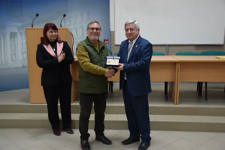 Ректорът на Русенския университет – акад. Христо Белов връчи плакет на ръководителя Пламен Георгиев и поднесе поздравителен адрес с благопожелания към всички хористи.