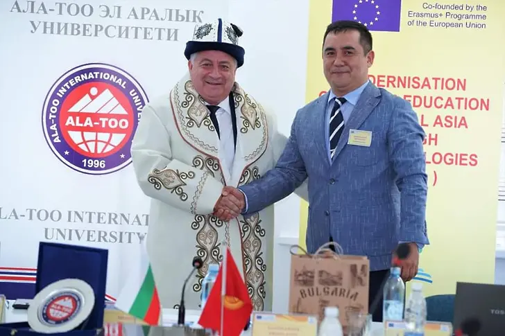 Акад. Белоев благодари за оказаната му висока чест и удостояването с почетното звание DOCTOR HONORIS CAUSA на Киргизския международен университет Ала - Тоо и направи ретроспекция на съвместните дейности и работата по проекти. Благодарение на проекта за Модернизация на висшето образование, по който работим съвместно вече четири години, ние правим голяма крачка в цифровизацията на нашите университети и адаптиране на образователните системи към дигиталното поколение, чрез внедряване в учебния процес на иновационни образователни технологии и дидактически модели.