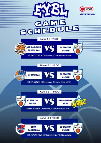 Спартак Плевен ще участва на още един турнир от Европейската младежка баскетболна лига. Това ще се случи в Острава, Чехия в периода между 29 януари и 1 февруари, когато тимът до 17 години на “синьо-белите”, воден от Антонио Станков, ще срещне силни съперници.
