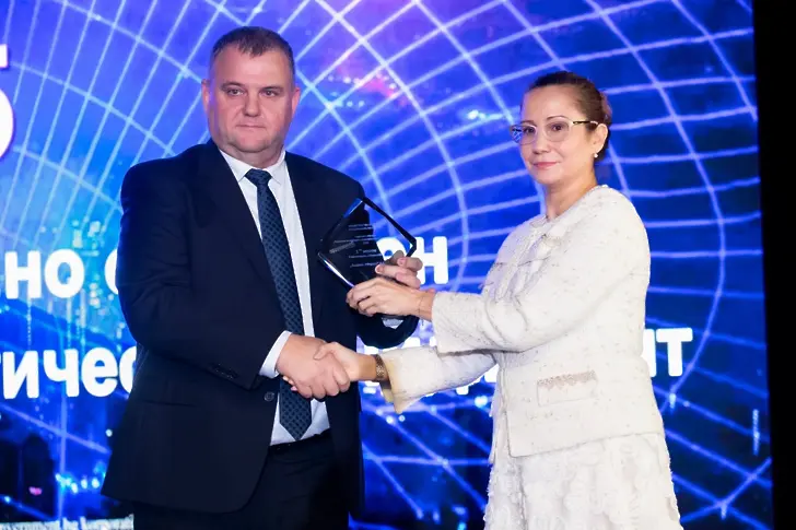 Гергана Алексова-Великова - заместник-министър на труда и социалната политика в оставка, връчи наградата на инж. Николай Пелтеков, изпълнителен директор на „Асарел-Медет“.