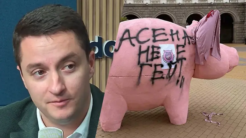 Народният представител от ПП-ДБ Явор Божанков бе специален гост в „Денят на Дарик“ и коментира казуса с разположеното пред Народното събрание огромно розово прасе касичка, което часове след появата си бе вандализирано със спрей и обиден надпис от „ДПС-Ново начало“.
