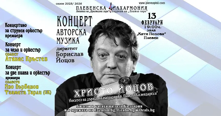 Плевенската филхармония представя авторски концерти с премиерни творби от Христо Йоцов, носител на наградата „Свети Паисий Хилендарски”.