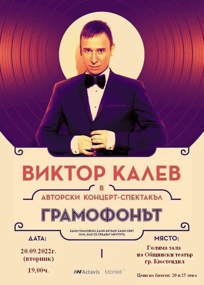 На 20 септември 2022г. от 19,00 часа в Голяма зала на Общински драматичен театър - Кюстендил гостува авторският концерт-спектакъл на Виктор Калев "Грамофонът".