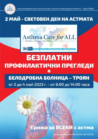 Белодробна болница – Троян ще отбележи Световния ден на астмата с безплатни профилактични прегледи, които ще се проведат от 2-ри до 5-ти май 2023 г. от 8:00 до 14:00 часа в приемните кабинети на лечебното заведение.