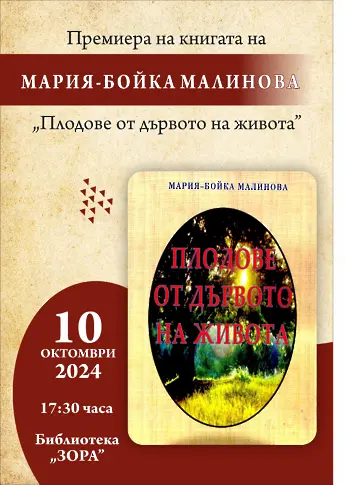 В библиотека „Зора” ще бъде представена книгата „Плодове от дървото на живота” от Мария-Бойка Малинова на 10 октомври от 17.30 часа.