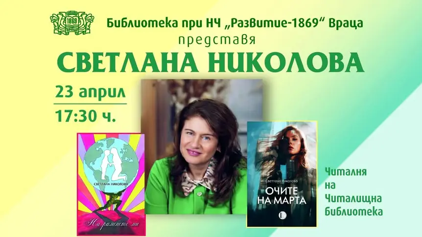 По повод 23 април – Световния ден на книгата и авторското право, библиотеката при Народно читалище „Развитие – 1869“ гр. Враца Ви покани на литературна среща със Светлана Николова.