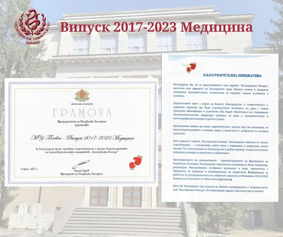 Благодарствена грамота от Президента на Р България Румен Радев получиха младите стажант-лекари от Випуск 2017-2023 на Факултет „Медицина“ в МУ-Плевен за направения благороден жест и принос в реализирането на благотворителната инициатива „Българската Коледа“.
