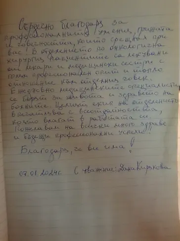 В Международния ден на думата "Благодаря" споделяме поредното признание за отлично свършената работа от медиците в отделението по онкологична хирургия към Комплексния онкологичен център в Русе.