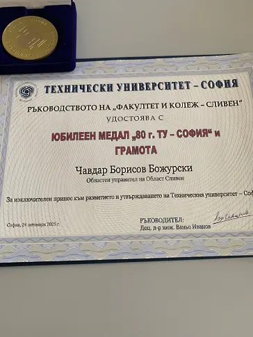 Областният управител Чавдар Божурски бе награден с юбилеен медал „80 години Технически университет - София“ и грамота. Отличието е за изключителен принос към развитието и утвърждаването на висшето учебно заведение. То бе връчено от проф. Иван Кралов, ректор на университета в периода 2019-2025 година.