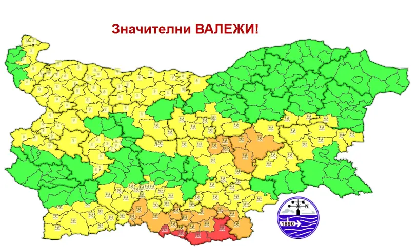 Червен код за значителни валежи обяви Националният институт по метеорология и хидрология за за част от областите Кърджали и Смолян. В област Кърджали червеният код е в сила за Кирково и Крумовград, а в област Смолян за Златоград и Рудозем. В останалите населени места на двете области е в сила оранжев код.