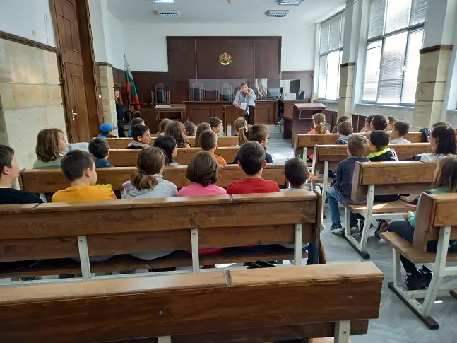 Децата бяха посрещнати от инж. Димо Водкаджиев, системен администратор в Окръжния съд, който обясни кои са основните участници в съдебните процеси, носят ли децата наказателна отговорност, при какви условия се прави разпит на дете. В разговора бе подчертано, че свидетелите са длъжни да говорят истината, като кажат всичко, което им е известно по делото. Разяснено беше, че членовете на съдебния състав на тайно съвещание решават виновен ли е подсъдимият и ако е виновен какво наказание да му бъде определено. Коментирано бе, че в съда и по време на съдебно заседание се спазват определи правила. При посещението си в Окръжния съд децата научиха още, че съдиите носят черни тоги.