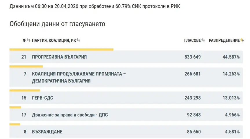 Убедителна победа за „Прогресивна България“ и пет партии в парламента според даниите на ЦИК към момента. Партията на Румен Расев води с 44,587%, сочат междинните резултати при обработени 60,79% протоколи на секционните избирателни комисии (СИК) в районните избирателни комисии (РИК) от изборите за народни представители за 52-рия парламент, произведени на 19 април. Данните са към 6:00 ч.