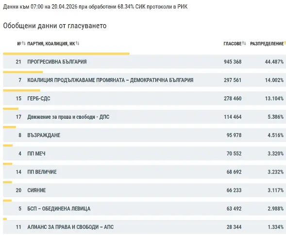 Партията на Румен Расев води с 44,587%, сочат междинните резултати при обработени 68,34% протоколи на секционните избирателни комисии (СИК) в районните избирателни комисии (РИК) от изборите за народни представители за 52-рия парламент, произведени на 19 април. Данните са към 07:00 ч.