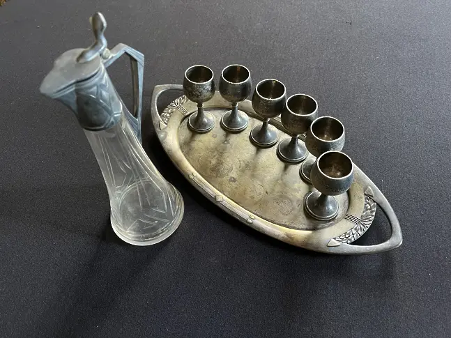 Сервизът е серийно машинно изделие, вероятно изработено от алпака през 30-те г. на ХХ век в стил Ар деко. Каната е от кристално стъкло с рязана украса. Подобни изделия се продават в русенските магазини и през 40-те и са част от буржазното всекидневие, а с тях дамите са пиели домашно приготвена вишновка.