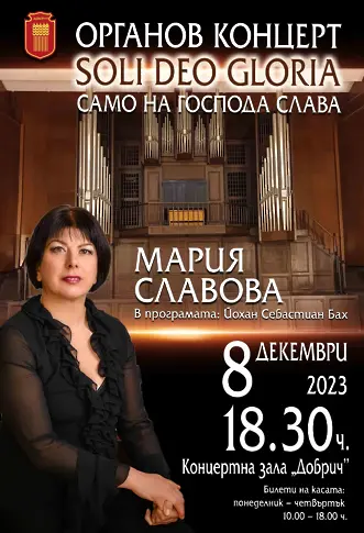 На 8 декември, от 18.30 часа, ще се състои органов концерт, с който ще започнат светлите коледни тържества в Добрич. Мария Славова ще зарадва всички, които искат да чуят звука от реновирания орган, с произведения на Йохан Себастиан Бах. Soli Deo Gloria (Само на Господа слава).