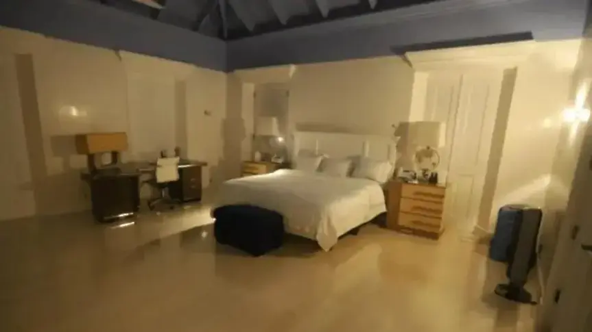 Няколко видеа показват луксозните площи на имота, наподобяващ курорт, включително басейн, палми и извиваща се пътека с изглед към океана. Една снимка улавя кабинет с черна дъска, на която са изписани думи като „власт“, „измама“, „заговори“ и „политика“.