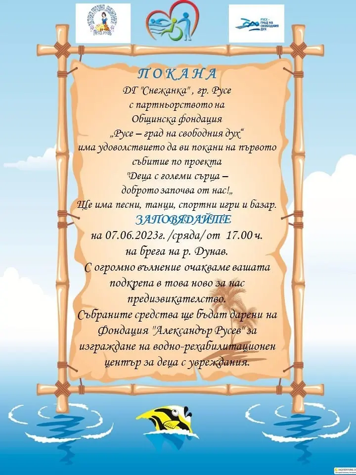 На 7 юни от 17 ч. на русенския кей, под музея на Баба Тонка, ще се проведе събитие с близо 340 деца от ДГ "Снежанка", техните родители и екипа на детската градина. То се осъществява с подкрепата на общинската фондация "Русе - град на свободния дух" и е под наслов "Деца с големи сърца - доброто започва от нас!". На детския празник ще бъдат представени различни спортни дейности, както и много песни и танци за най-малките. На амфитеатъра ще бъде подреден благотворителен базар с тематични сувенири, рисунки и предмети, сътворени от децата на ДГ „Снежанка“ и техните родители. Събраните средства ще бъдат дарени в помощ на каузата на Фондация "Александър Русев" за изграждане на водно-рехабилитационен център за деца с увреждания.