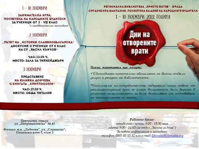 Занимателна игра, посветена на народните будители и дискусия „Пътят на История славянобългарска” организира Регионална библиотека „Христо Ботев” - Враца в Дни на отворените врати – посветени на Деня на народните будители.