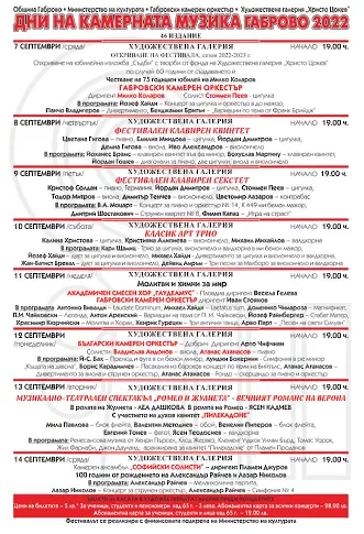 След една седмица, на 7 септември, сряда, от 19 часа, в Художествената галерия „Христо Цокев“ ще се открие 46-тото издание на Дните на камерната музика Габрово 2022. Благодарение на щедра субсидия от Министерството на културата, това ще бъде най-мащабното издание на фестивала в цялата му история. Ще ни гостуват два оркестъра, хор от Пловдив, а пред Габровския камерен оркестър ще застане неговият предишен дългогодишен диригент Милко Коларов.