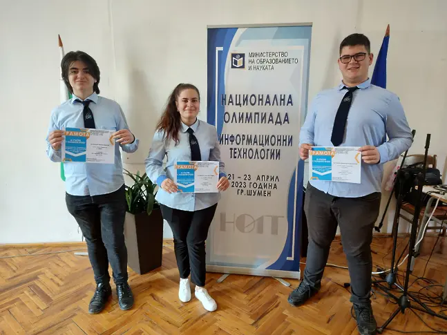 За поредна година СУ „Любен Каравелов“ - гр. Добрич, има повод за гордост. Георги Димитров и Мелис Сали от 11 клас защитиха достойно проект “Умно кошче” и спечелиха първо място на Националната олимпиада по информационни технологии, която се проведе на 22.04.2023 г. в ППМГ „Нанчо Попович“, гр. Шумен. Лауреатите на олимпиадата се състезаваха в категория "Големи обеми от данни" и завоюваха 90 точки. В националния кръг взе участие и деветокласникът Матей Димов, който се класира на 12 място с проекта си „Високо“, категория "Мултимедийни приложения" 8-10 клас. Официален организатор и основен спонсор е МОН.