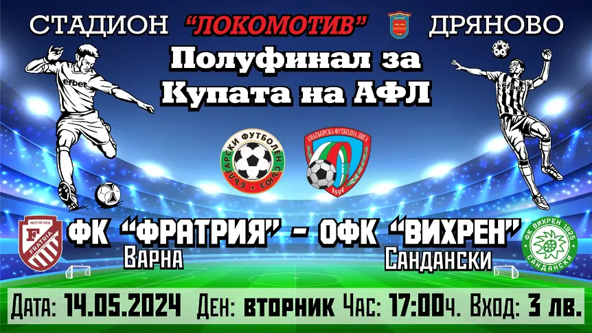 На 14 май /вторник/, от 17: 00 ч. на стадион „Локомотив” в Дряново, отборите на ФК „ФРАТРИЯ” Варна и ОФК „ВИХРЕН” Сандански ще премерят сили в среща полуфинал за Купата на Аматьорската футболна лига на България.