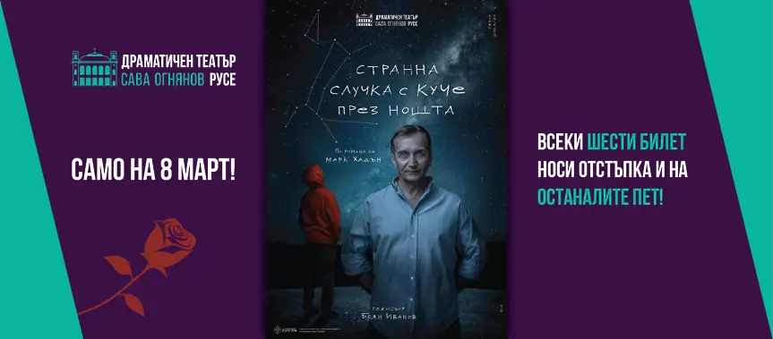 На 8 март сме подготвили празничен жест към дамите, пък и не само към тях. Под мотото “Всеки шести билет носи отстъпка и на останалите пет” ви очакваме в театъра за спектакъла “Странна случка с куче през нощта” по романа на Марк Хадън. Дебют за Калоян Желев с гост-актьор Стоян Радев. Идеята е в комбинация с още няколко познати и приятели да си осигурите отстъпка в цената, но и да гледате постановка с три номинации за Националните награди за сценични изкуства ИКАР 2024.