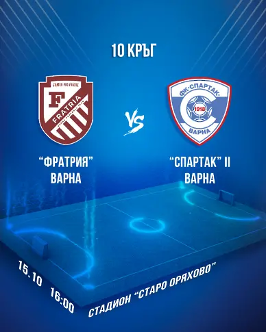 моциите за феновете на "соколите" не спират и в паузата на шампионата. Първият тим на Спартак няма двубой, но всички спартаклии могат да подкрепят дублиращия отбор, който ще излезе в един от най-важните си мачове през есента. ФК Спартак" (Варна) II гостува на Фратрия в 10-ия кръг на Североизточна Трета лига, съобщава фейсбук страницата на варненския клуб. Срещата е в неделя, 15-и октомври от 16 часа на стадиона в Старо Оряхово. "Соколите", водени от Ивелин Петков са лидери в класирането с 18 точки след 6 победи. На терена в регионалното дерби ще излязат и някои от играчите, които сме свикнали да виждаме с екипа на първия отбор във Втора лига.