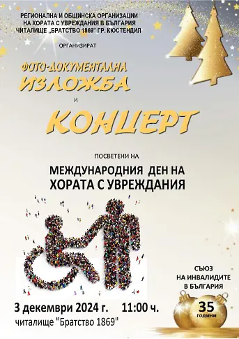 На 3 декември 2024 г. от 11:00 ч. в читалище „Братство 1869“ Кюстендил ще бъде открита фото-документална изложба и ще се проведе Празничен концерт, посветени на Международния ден на хората с увреждания. Инициативите се организират съвместно с Регионална и Общинска организации на хората с увреждания и НЧ „Асклепион 2008”. Тази година компанията е посветена и на 35 годишнината от създаването на Съюз на инвалидите в България.