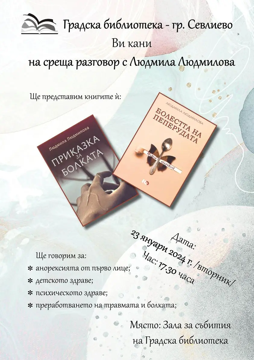 Людмила Людмилова е учител по биология и химия в СУ ,,Максим Райкович" - Дряново. Тя е терапевт, психолог и писател. През 2017 г. излиза книгата ѝ "Болестта на пеперудата", в която тя разказва за анорексията на дъщеря си и нейният начин за справяне.