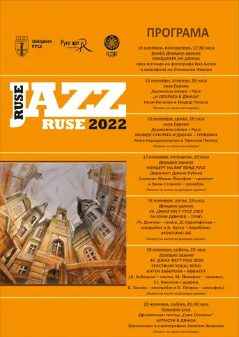 18 и 19 ноември /петък и събота/ от 19 ч. започва Джаз фест Русе 2022. В 46-ото издание на престижния форум ще се представят любими изпълнители като Антони Дончев трио и Ангел Заберски квинтет, за първи път ще чуем Montuno-BG с Краси Желязков и Спектрум вокал бенд. Билети за 17, 18 и 19 ноември се продават на касата на Доходното здание.