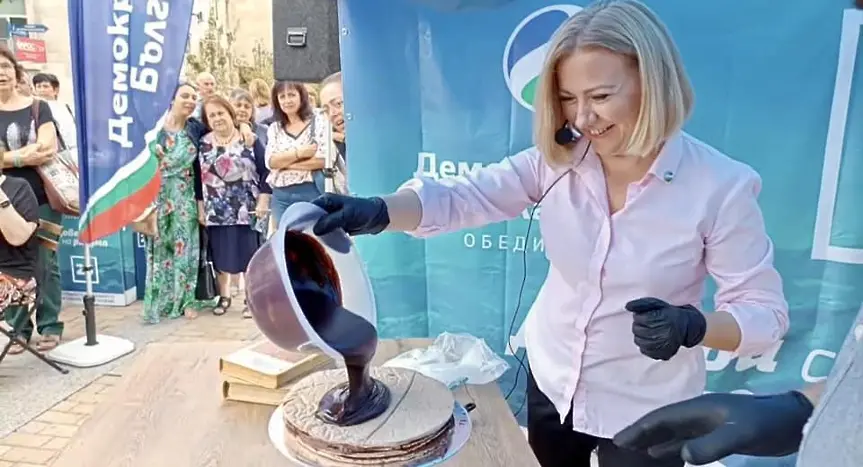 “Като бях дете, това действие го вършехме с лъжица, сега шпатулите са далеч по-удобни. Но като гледам как прекрасно се маже този блат, си мисля, че една от темите, които “Демократична България” си поставяме, е да направим държавата и системата така, че управляващите да не мажат, да не замазват грешките, а престъпниците да бъдат добре разследвани и наказвани и във всяко нещо си има майсторлъка, като при тортата, крема е важен”, продължава Надежда.
