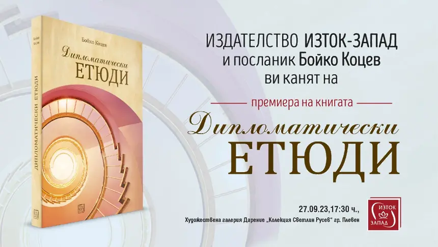 Книгата си "Дипломатически етюди" ще представи в Плевен експосланикът на България Бойко Коцев на 27 септември /сряда/ в 17:30 ч. в ХГ "Светлин Русев".