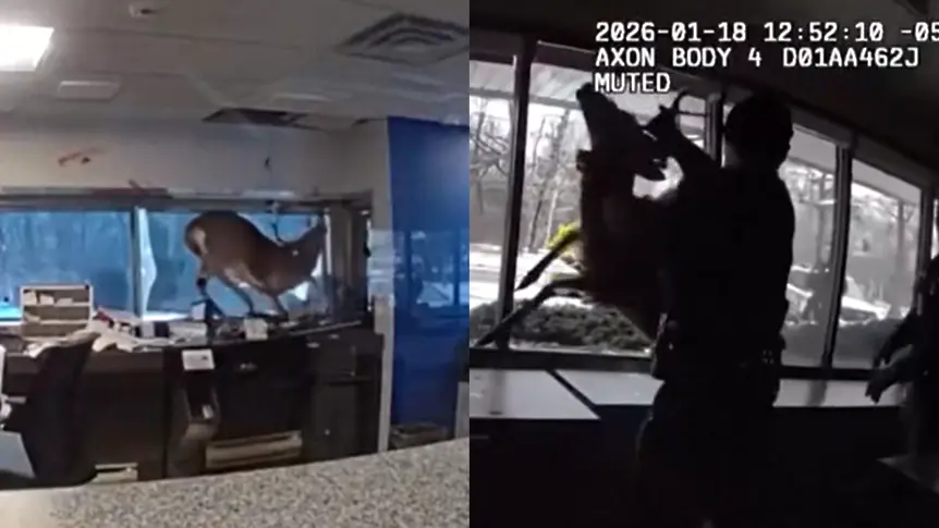 Необичаен опит за обир край Ню Йорк – елен нахлу през прозореца на банка. Полицейски отряд се отзовава на сигнал за грабеж.