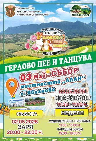 Община Котел, кметство Ябланово и НЧ "Възраждане" съобщават, че традиционният пролетен празник „Герлово пее и танцува“ ще се проведе на 3 май 2026 г. Събитието включва музикални и фолклорни изпълнения, детски програми и традиционни народни борби.