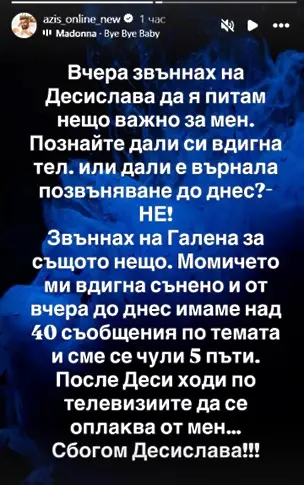 Какъв е бил въпросът, по който е търсил Десислава, остава неизвестно. Но публикацията на Азис завършва категорично: „Сбогом, Десислава.“
