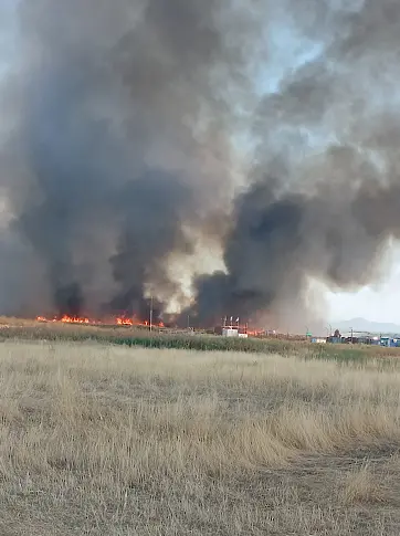 Гъст черен дим се издига над огнената стихия.