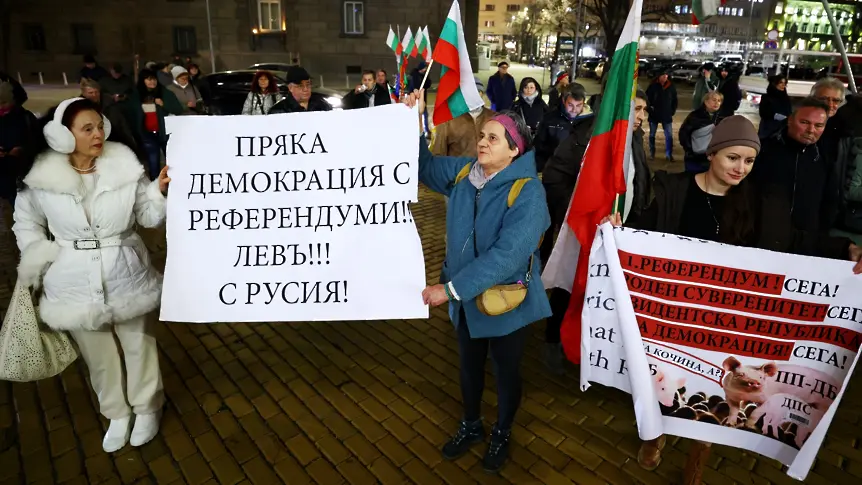 Протестиращи държат плакати с надписи: "Не на еврото", "Време е да те чуят, не на еврото", "За какво ни е евро, ако изгубим България", "Пряка демокрация с референдуми!!! Левъ! С Русия".