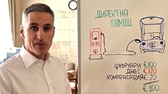 Служебният премиер Андрей Гюров публикува в социалните мрежи видео, в което с рисунка на бяла дъска обяснява защо държавната помощ за гориво е 20 евро.