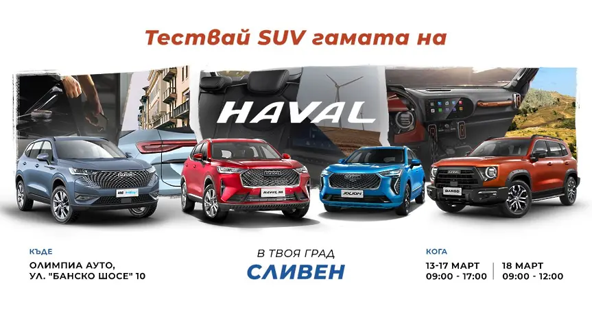 Каним Ви да станете част от вълнуващото тестдрайв събитие на HAVAL в новия продажбен комплекс на марката в гр. Сливен. Очакваме Ви от 13 до 18-ти март в комплекс „Олимпиа Ауто“, бул. „Банско шосе“ 10. На място ще може да се запознаете с цялата SUV гама на марката, както и да тествате автомобила, който отговаря на Вашия стил и предпочитания.